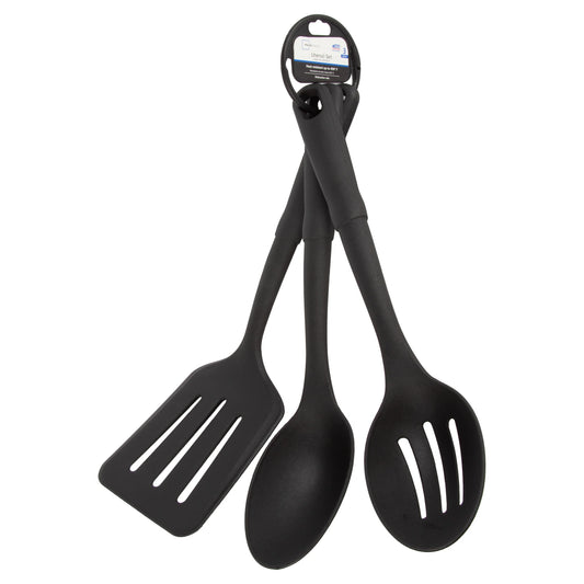 3-Piece Kitchen Utensil Set, Slotted Spatula, Slotted Spoon and Solid Spoon, Black, Nylon