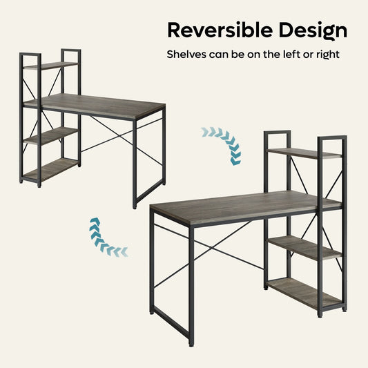 47" Computer Desk with Adjustable Shelves, Writing Desk with Reversible Bookshelf, Retro Grey Oak-Dark